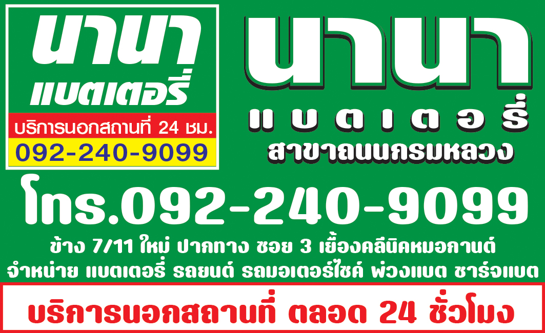 นานาแบตเตอรี่ ถ.กรมหลวง เปิดให้บริการทุกวัน ไม่มีวันหยุด 08.00 น. - 21.00 น. นอกสถานที่ 24 ชั่วโมง